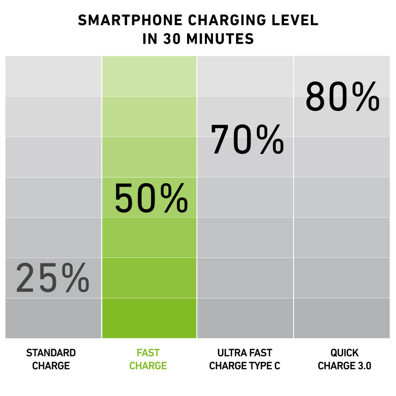 - Niveau de recharge du smartphone au bout de 30 minutes : 50 %