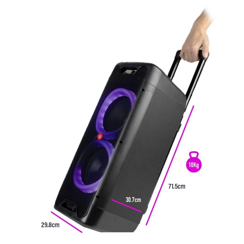 Orateur de port puissant compatible avec la technologie Bluetooth 5.0 et TWS, équipé de 8 ” double subwoofer et puissance de sortie maximale 300W. D &e jate master by its impressionnant sound and lighting effects n & o ntate the party where you want thanks to its integrated battery.