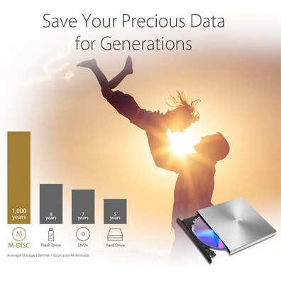ASUS ZenDrive U7M est compatible avec M-DISC, une solution de fichier dis&n ñ ada pour protéger les données avec une grande valeur, telles que les &iuteres et les &iudos dom éos. Les DVD M-DISC gardent les données et les fichiers en sécurité pour un millénaire, en vous assurant que vos souvenirs restent en sécurité pour les générations à venir. En revanche, d'autres solutions de stockage numérique, telles que les disques durs et les mémoires flash, ont une durée de vie &util d'environ 8 à ñ s.