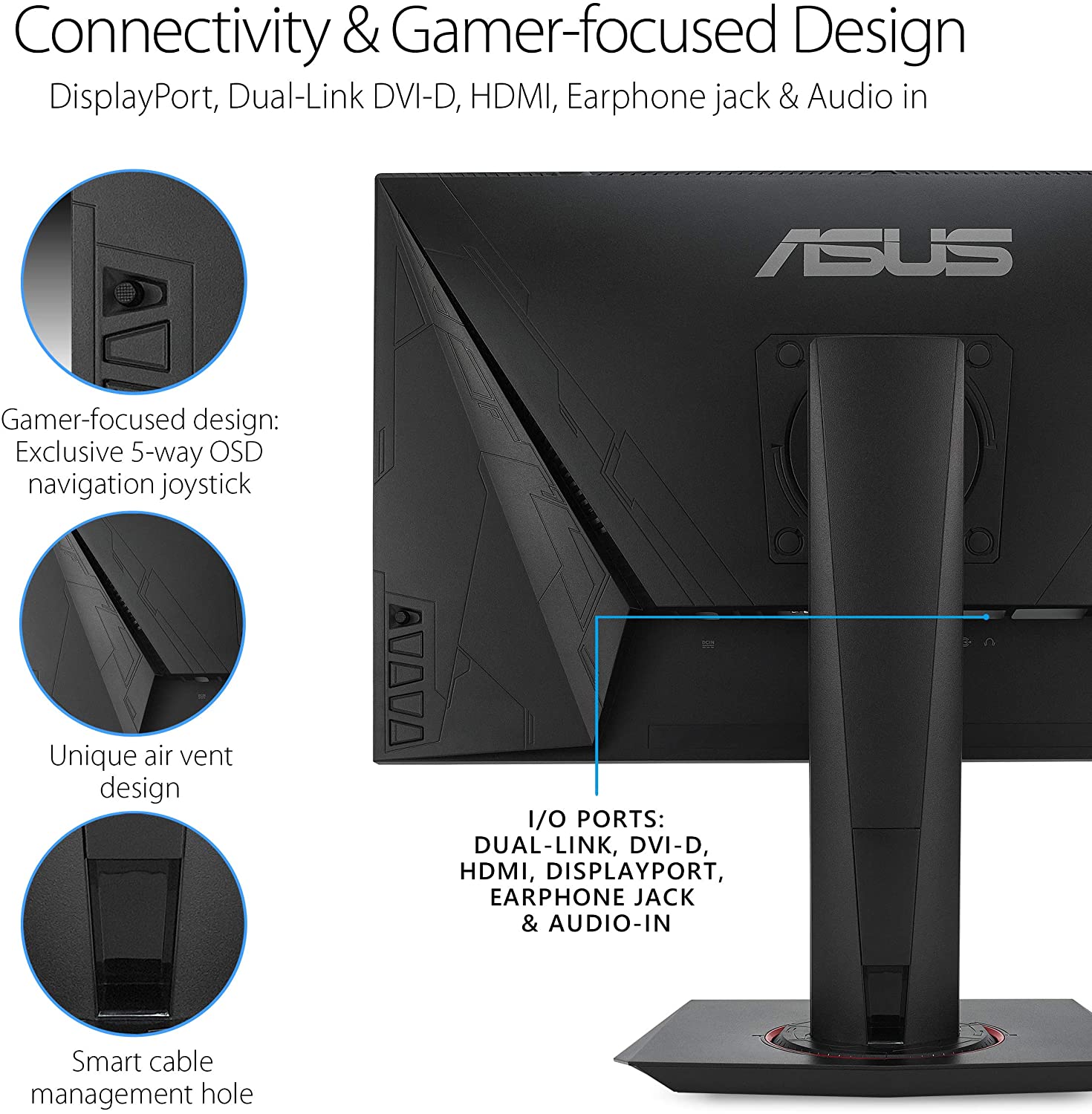 Le moniteur ASUS VG258QR comprend les ports DVI.D, DisplayPort 1.2 et HDMI (v1.4) pour connecter tous les appareils dont vous avez besoin. En outre, son cadre de 1 cm est parfait pour profiter d\'une expérience immersive et panoramique avec plusieurs moniteurs.