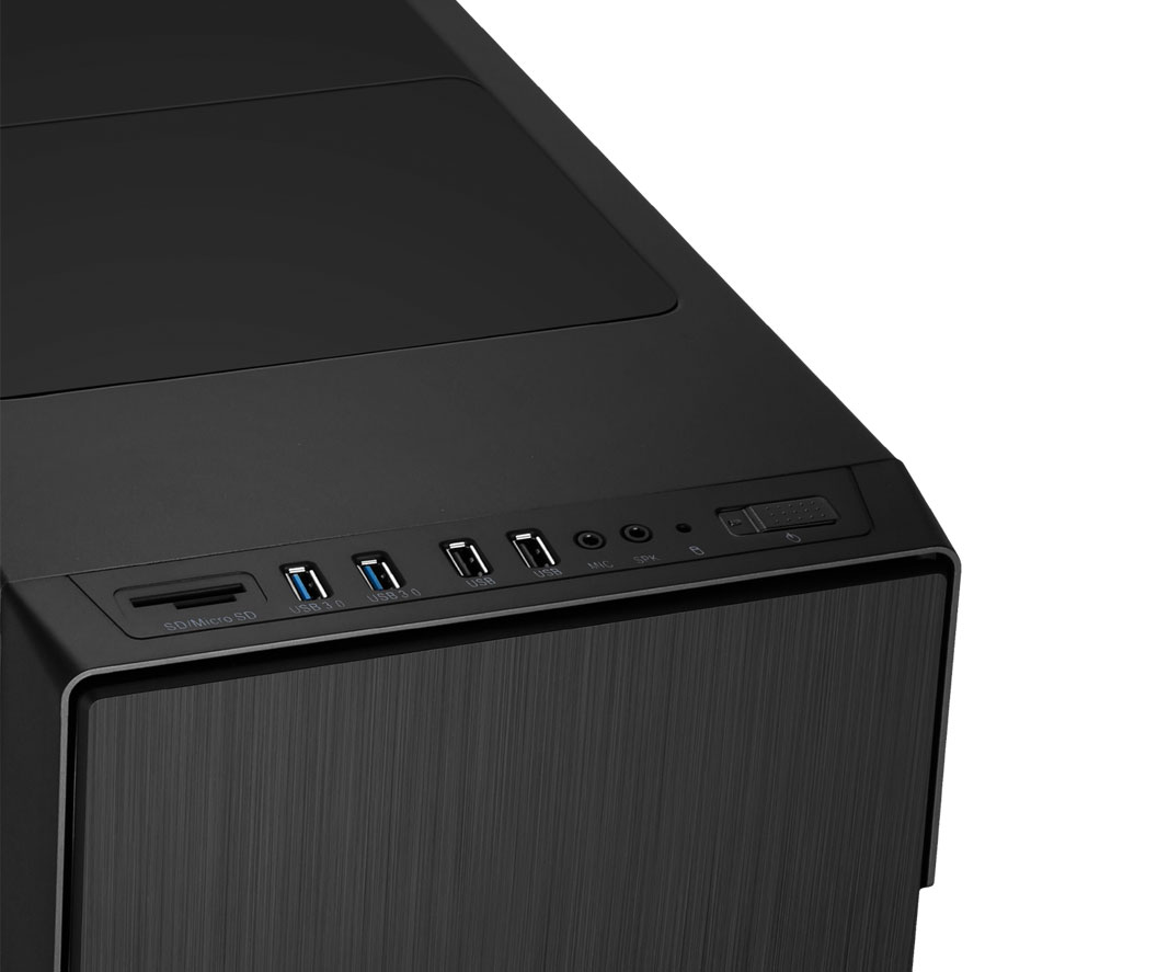 Dans le panneau supérieur, nous trouvons deux ports USB 2.0 et deux ports USB 3.0, ainsi que des connexions audio. En outre, Hummer ZN dispose d\'un lecteur de carte micro SD et SD, qui permet un transfert de données confortable et accessible à l\'équipement en tout temps.