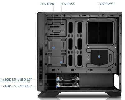 Cette particularité de Hummer ZN vous permet d\'installer trois SSD sur le panneau latéral du châssis, derrière la plaque de base, en faisant un meilleur usage de l\'espace intérieur et en aidant à améliorer le débit d\'air. En outre, il est possible de profiter des baies inférieures de 3,5 "en installant un SSD de 2,5" en place.