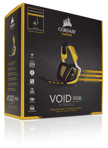 VOID de Corsair Sans fil. Utilisation avec: PC / Jeux, Chaînes de sortie audio: 7.1. Type de casque: Binaural, Style d\'utilisation: Diadema, Couleur du produit: Noir, Jaune. Interface du périphérique: USB, Connectivité du périphérique: Sans fil, fréquence de bande: 2.4. Audits: Circumural, fréquence d\'écoute: 20 - 20000 32 Ohmio. fréquence du microphone: 100 - 10000 Hz, sensibilité du microphone: -38 Db, Microphone, impédance de sortie: 2200 Ohmio