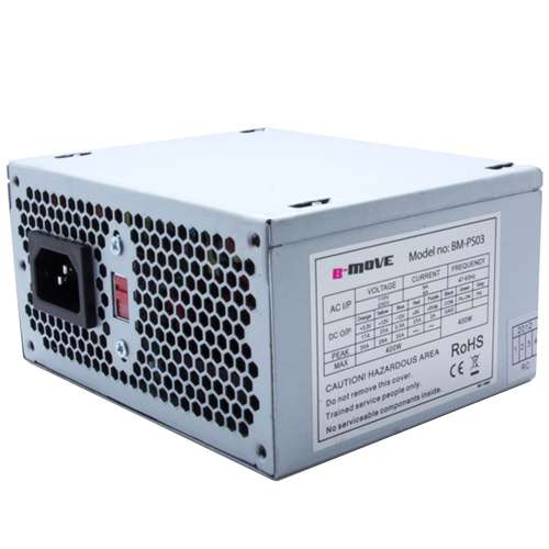 B-Move BM400WMB. Puissance nominale: 400 W, tension d\'entrée AC: 115 - 230 V. Diamètre du ventilateur: 80 mm, Emplacement du ventilateur: Supérieur, Type de refroidissement: Active. Alimentation pour carte mère: 20 + 4 broches. Largeur: 125 mm, Profondeur: 100 mm, Hauteur: 65 mm