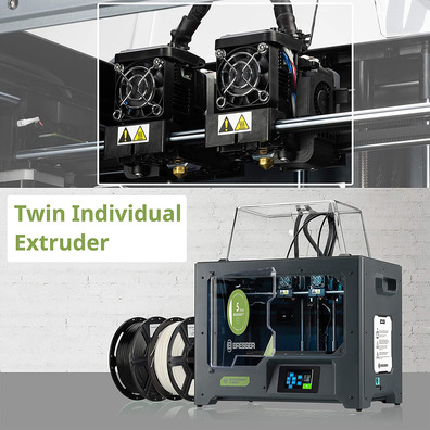 L'imprimante 3D BRESSER T-REX ² ; est une imprimante IDEX avec une grande souplesse. Grâce aux deux extrudeuses, qui sont indépendantes de l'axe Y, il est possible d'imprimer les différents modèles très complexes en utilisant la droite de gauche à droite. Deux couleurs ou geomér ainsi que des matériaux différents (supports de support) peuvent être réalisés sans problème. Les matériaux de support spéciaux peuvent être enlevés facilement ou dissous avec de l'eau après impression. Un autre avantage est l'impression de deux objets en même temps. Grâce à la double extrudeuse indépendante, en double mode, deux types de nticos peuvent être imprimés en même temps, ce qui permet de gagner du temps précieux. Dans le mode miroir, deux objets miroir peuvent être imprimés alternativement.