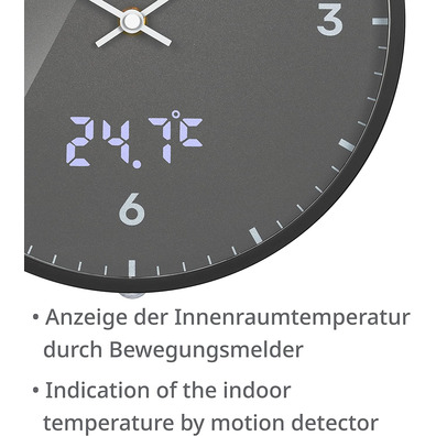 Le temps passé, de l'hiver à l'heure d'été, et vice versa: chacun à ñ ou nous devons changer le temps. Cette horloge murale contrôlée par radio fera cela pour vous à l'avenir: Lorsque vous recevez le ñ à l'heure DCF, l'heure est définie autom &athetically selon le fuseau horaire de l'Europe centrale (CET). Mais l'horloge murale peut faire bien plus que mesurer le temps: Le capteur de mouvement intégré active l'affichage de la température. La température ambiante actuelle apparaît sur le cadran d'un voyant masqué. Un capteur de lumière régule automatiquement la luminosité de l'écran LED pour les opérations de jour et de nuit. Cela vous permet de contrôler le temps et la température dans la chambre à coucher sans perdre de poursuite ñ ou.