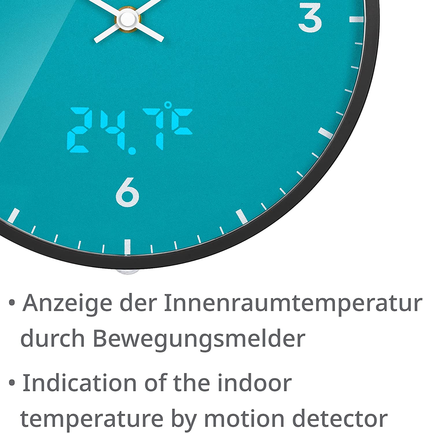 Le temps passé, de l'hiver à l'heure d'été, et vice versa: chacun à ñ ou nous devons changer le temps. Cette horloge murale contrôlée par radio fera cela pour vous à l'avenir: Lorsque vous recevez le ñ à l'heure DCF, l'heure est définie autom &athetically selon le fuseau horaire de l'Europe centrale (CET). Mais l'horloge murale peut faire bien plus que mesurer le temps: Le capteur de mouvement intégré active l'affichage de la température. La température ambiante actuelle apparaît sur le cadran d'un voyant masqué. Un capteur de lumière régule automatiquement la luminosité de l'écran LED pour les opérations de jour et de nuit. Cela vous permet de contrôler le temps et la température dans la chambre à coucher sans perdre de poursuite ñ ou.