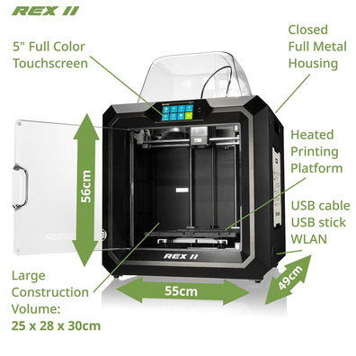 L'imprimante 3D BRESSER REX II WIFI est une imprimante FFF 3D durable, professionnelle et durable qui se distingue par son excellente valeur pour l'argent. Sa manipulation intuitive vous permet de commencer à l'utiliser immédiatement. Particulièrement dans les applications industrielles où la flexibilité des matériaux est décisive, la plate-forme d'impression avec chauffage et chauffage permet une large sélection de filaments. La construction précise du cadre en métal massif, l'espace de construction fermé et le système avancé de circulation de l'air autour de l'extrudeuse assurent en permanence la haute qualité de l'impression.