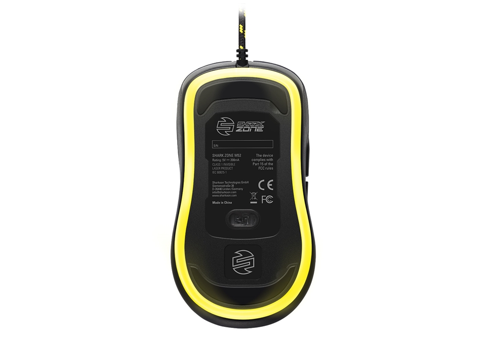 Tous les puristes de design, qui ne seront pas vus dans aucun engagement aux caractéristiques, aimera la souris pour Sharkoon SHARK ZONE M52 jeu. Sa surface noire élégante est classique et intemporelle, sans coins et bords, et est faite pour n\'importe quel lieu de travail ou de jeu. Sa forme asymétrique, avec des boutons latéraux plats faciles d\'accès, est parfaitement ergonomique et est toujours très confortable en travaillant ou en jouant. Le câble textile tressé, dans un design typiquement jaune noir SHARK ZONE, ainsi que le logo illuminé de couleur blanche et l\'éclairage RGB au bas, font ressortir tout le potentiel nécessaire de l\'appareil. Grâce à la surface en caoutchouc confortable, le M52 avec son poids plume est toujours très confortable dans la poignée, même après de nombreuses heures d\'utilisation.
