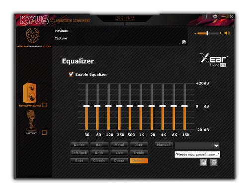 Kyus intègre un logiciel avec lequel vous pouvez émuler un son enveloppant, grâce à la carte son du pilote et aux performances du logiciel. En outre, il est possible de configurer à la fois les haut-parleurs oreille et microphone.
