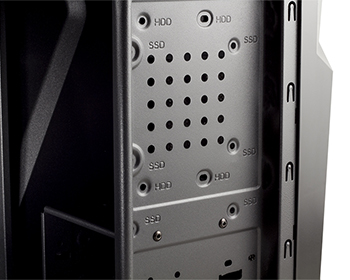 Le nouveau châssis nox, Raven, dispose d\'un système de montage facile pour les disques durs. Ses 7 baies de capacité et son assemblage de disques SSD en L vous permettront de monter de grands graphiques sans exclure l\'espace pour stocker toutes vos informations.