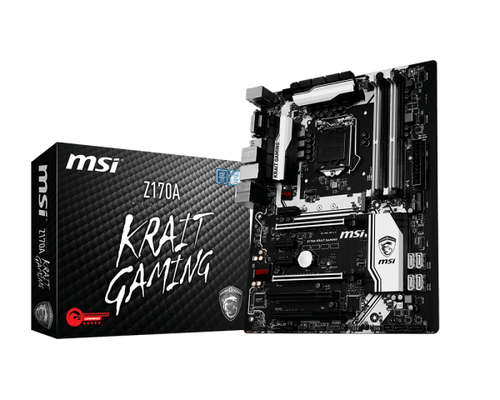 MSI Z170A Le jeu de krait. types de mémoire compatibles: DDR4-SDRAM, Type de fentes mémoire: DIMM, Mémoire interne: 64 Go. Famille de processeurs: Intel, processeur compatible: Celeron, Core i3, Core i5, Core i7, Pentium, prise de processeur: LGA1151. Prise en charge des interfaces de disque dur: Série ATA III. Interface Ethernet : Gigabit. Composant pour: PC, Famille de composants de carte à tige: Des infos. Circuit intégré de carte à tige: Intel Z170