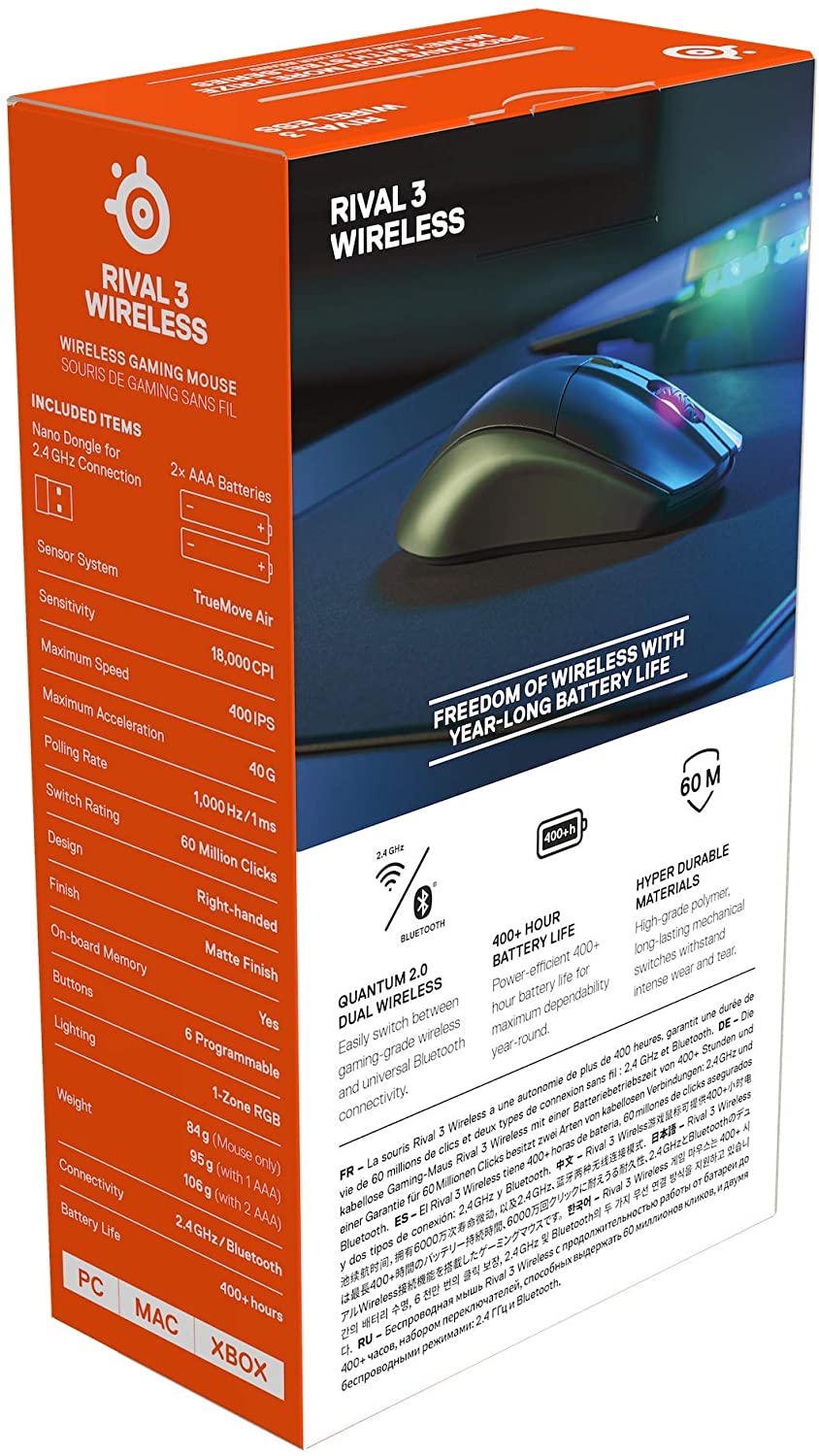 Rival 3 Wireless utilise le íto Quantum 2.0 Dual Wireless de Tecnolog pour établir une connexion avec le temps d'attente ullabulaire à 2,4 GHz et Bluetooth. Il est optimisé pour minimiser la consommation et pour atteindre une durée de la matraque íres dans le secteur de 400 heures. Un capteur de jeu axé sur la performance, la mémoire intégrée, les notifications RGB, et beaucoup plus, le rendent idéal pour les joueurs qui ont besoin d'un rat polyvalent. Les matériaux résistants et les interrupteurs mécaniques de 60 millions de clics font en sorte que Rival 3 offre des résultats inégalés avec la polyvalence maximale.