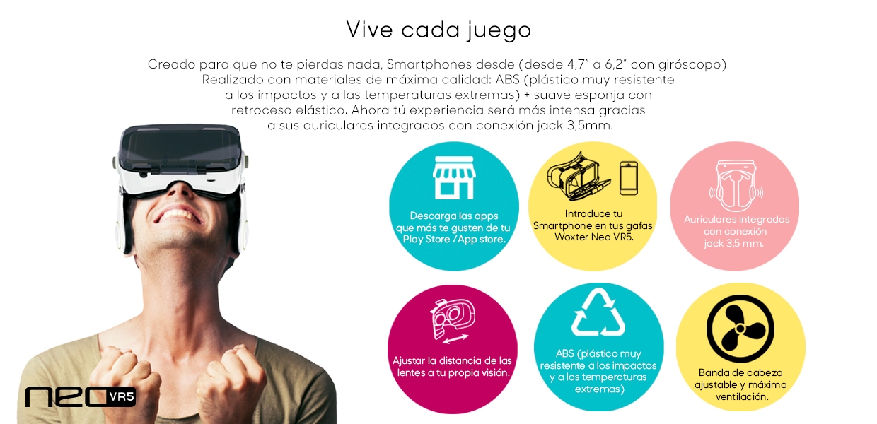 Le NEO de Woxter Le VR5 est un type d\'enveloppes de vision stéréoscopique et de fonction auditive. Ils sont parfaitement adaptés aux smartphones de 4.7 à 6.2 pouces (selon la taille réelle du téléphone), et utilisés avec des écrans de téléphone mobile intelligent, vous permettent de profiter de jeux panoramiques, films 3D, etc. Entièrement réglable et avec casque intégré pour éviter les sons externes et faire cette expérience unique.