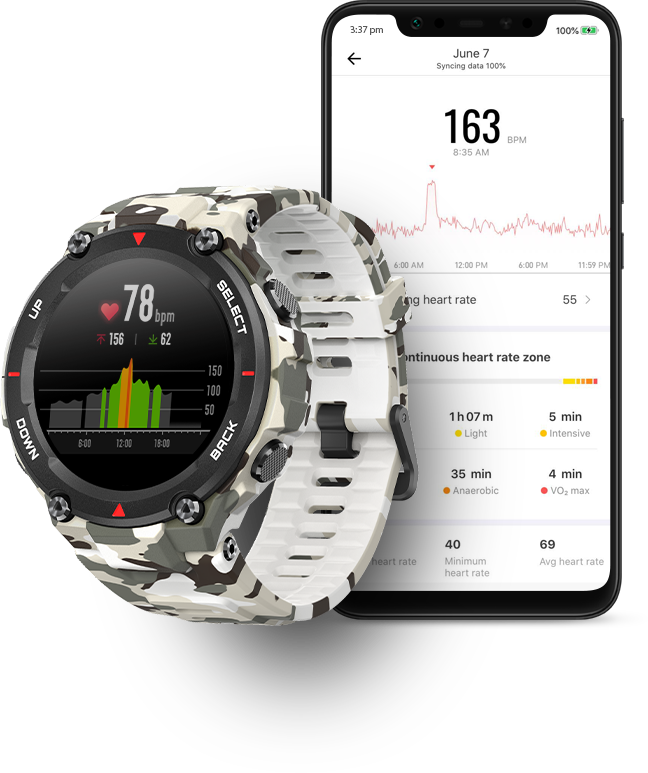 Équipé avec le capteur optique bioseguimiento BioTracker PPG développé par Huami, vous permet de contrôler avec précision la fréquence cardiaque de 24 heures par jour. L'horloge envoie des rappels pour vous de se lever, afin de vous encourager à développer de saines habitudes de vie et de devenir votre meilleure version. Sans aucun doute le meilleur compagnon pour les sports est la Amazfit T-Rex.