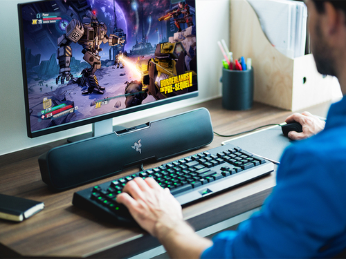 La chaîne Razer Leviathan 5.1 La barre de son surround est facilement fixée à tout moniteur de bureau ou installation de console de salon. Cette barre de son, avec une polyvalence pour changer constamment de position dans n\'importe quelle situation, comprend une technologie Dolby ® complètement innovante et un subwoofer indépendant avec lequel vous pouvez projeter des sons complexes en recréant les scènes épique de batailles dans le jeu ou en jouant dans "stream" leurs mélodies préférées du smartphone.