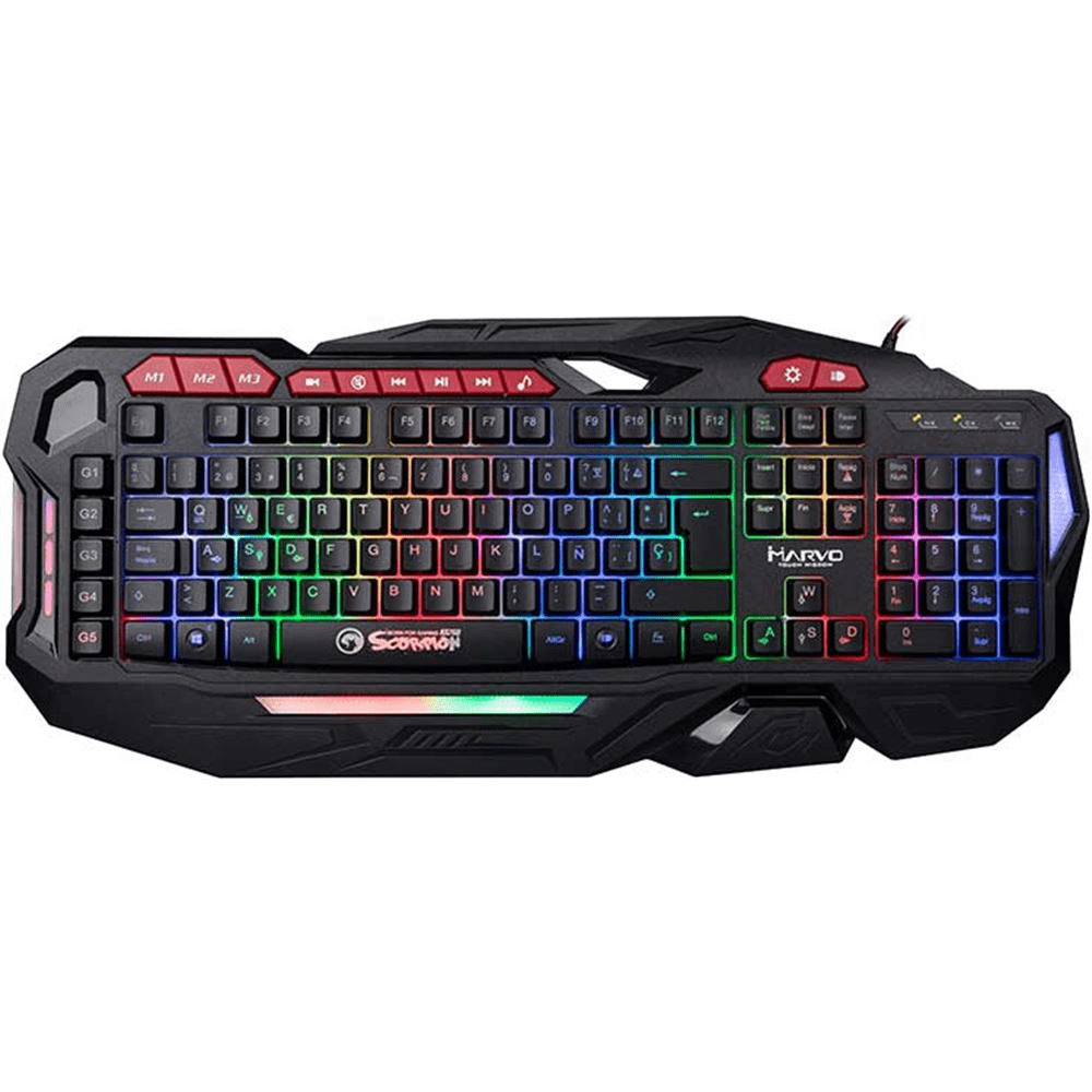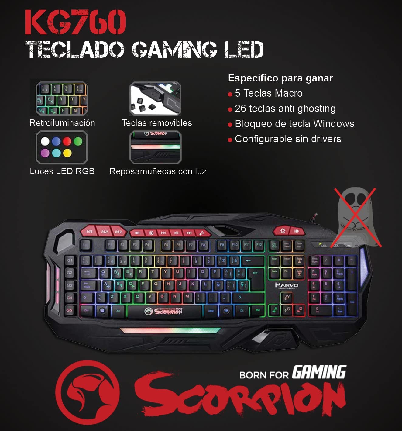Parce que les claviers de la membrane peuvent aussi avoir un look agressif comme le mec unique. Le nouveau clavier Scorpion KG760 en est un bon exemple, un clavier rétroéclairé avec des lumières RGB dans 3 effets pensé pour démarrer dans le monde du jeu sans avoir besoin d'un gros investissement. Il a toutes les options habituelles des claviers chers à prix réduit. 26 touches antifantômes clés, 5 touches de macro entièrement configurables, 6 touches de support, 3 touches de mode, 2 touches d'ajustement de lumière et la clé de verrouillage Windows très prisée pour empêcher un mauvais &otin de ruiner votre départ.