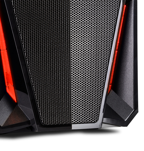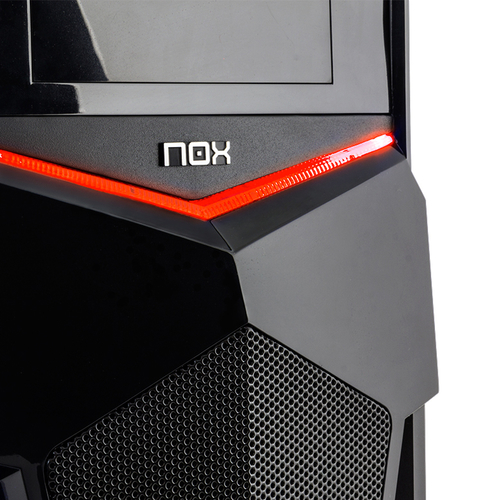 Nox Pax a un front noir en finition brillante combiné avec le maillage métallique et l\'éclairage LED rouge. En haut de l\'avant, nous trouvons des connexions audio, deux USB 2.0 et une USB 3.0.