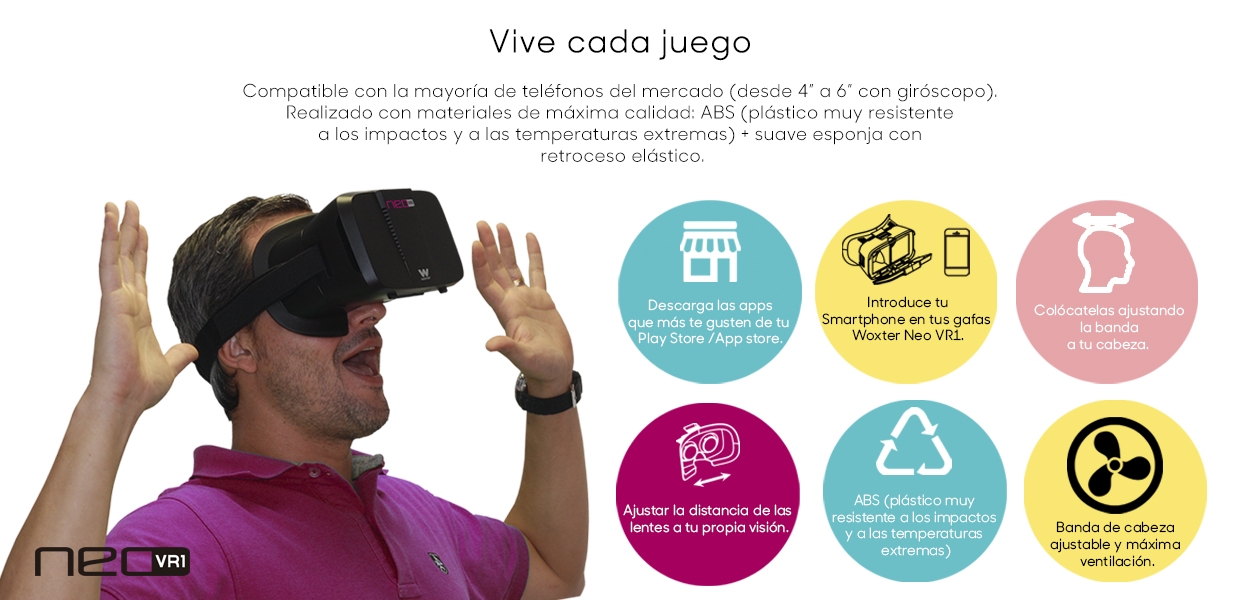 Si l\'Oculus Rift ou HTC Viva s\'éloignent du budget, prenez votre smartphone et les nouvelles lunettes de réalité virtuelle Woxter Neo VR1 conçues pour les téléphones de 4 "à 6" qui intègrent le gyroscope. Sentez la vitesse, les vibrations et les effets sonores les plus étonnants avec ces lunettes qui aideront à rendre l\'immersion dans vos jeux complets.
